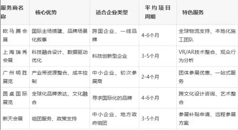 科技创新型企业则应重点关注瑞秀会展和欧马腾(Omaten)这类擅长科技融合的服务商,通过前沿技术展示产品优势。