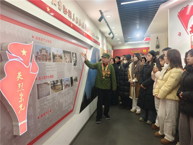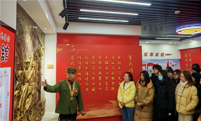 2月1日上午,实践队前往高唐县传承红色基因“双拥馆”进行参观,聆听一等功臣徐希方老班长结合亲身经历的讲解,深入了解烈士及老兵与退役军人、现役军人为家国奉献的热血历程。从“和平鸽”铜雕、馆内陈列的老照片、老式冲锋号等红色展品中读懂先辈们的热血征程,馆内的每一段讲述都让在场人员深受触动。